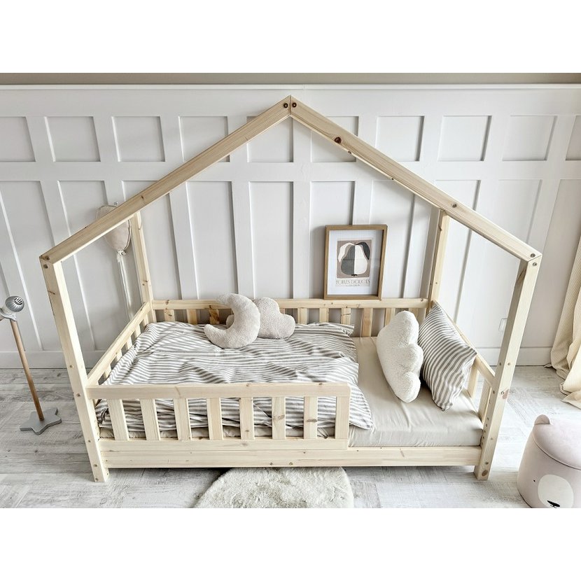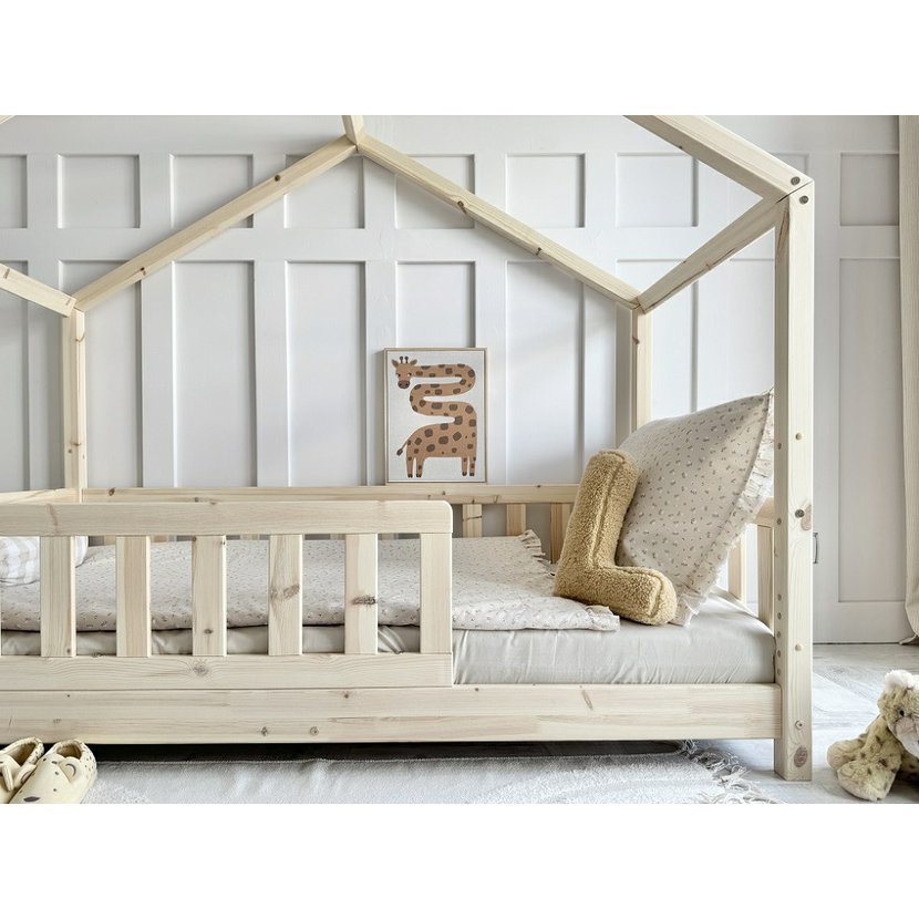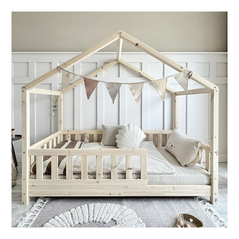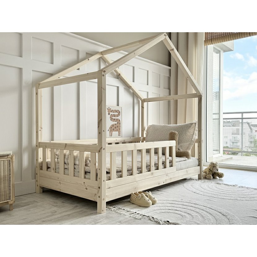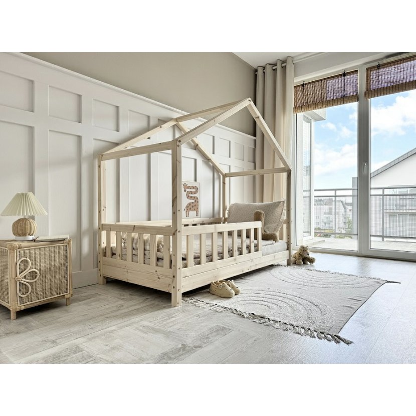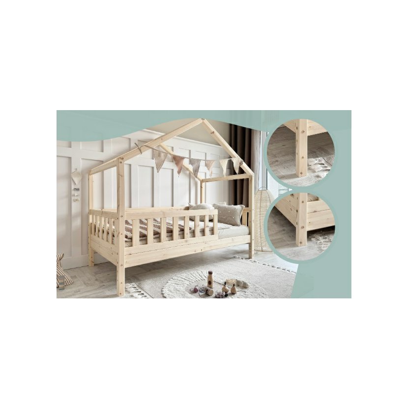 Domečková postel Housebed Gabby z kolekce Pure Wood v prostorném rozměru 120 × 200 cm je jako malý dřevěný zámek, kde sny získávají svůj vlastní kout. Každý suk a jemná kresba borovicového dřeva vypráví příběh přírody, přináší do pokoje teplo a klid. Stabilní konstrukce ve tvaru domečku zve k hraní, fantazii i odpočinku, zatímco bezpečná zábrana a pevný lamelový rošt poskytují klidný spánek. Minimalistický, přírodní design z masivního dřeva promění dětský pokoj v prostor, kde se realita setkává s kouzlem snů.