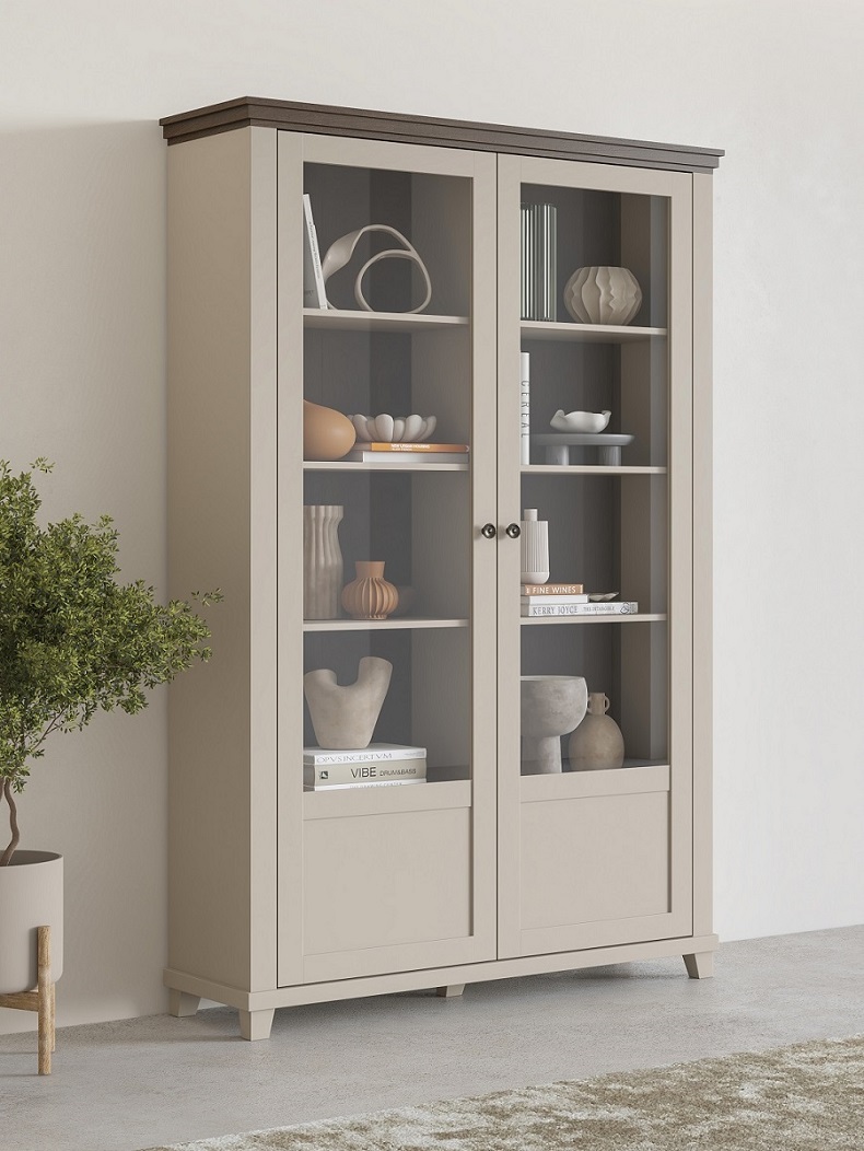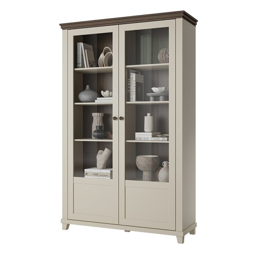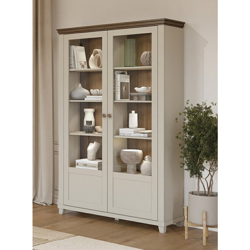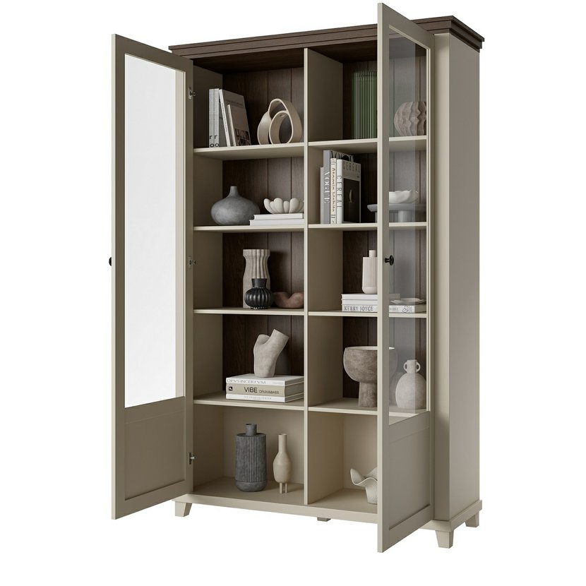 Elegantní dvoudvéřová vitrína Evora 3, nyní v jemném světlém béžovém odstínu s akcentem dekoru dub dunin, přináší do vašeho interiéru světlost a přirozený kontrast. Tato kombinace dodává nábytku příjemný, nadčasový ráz, který zjemní prostor a zároveň zachovává útulnost dřevěného vzhledu.