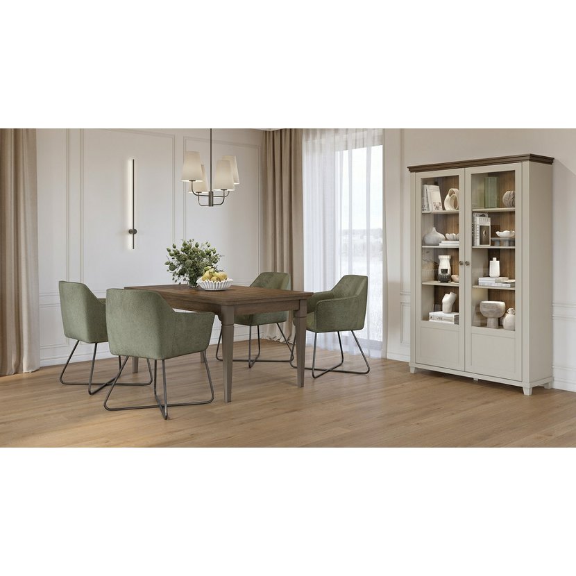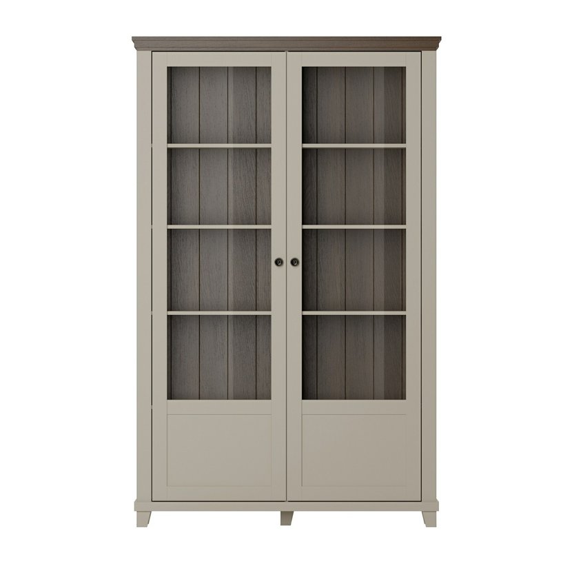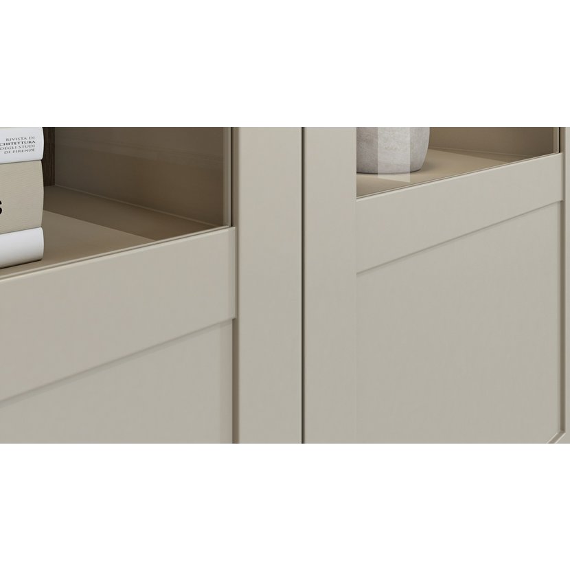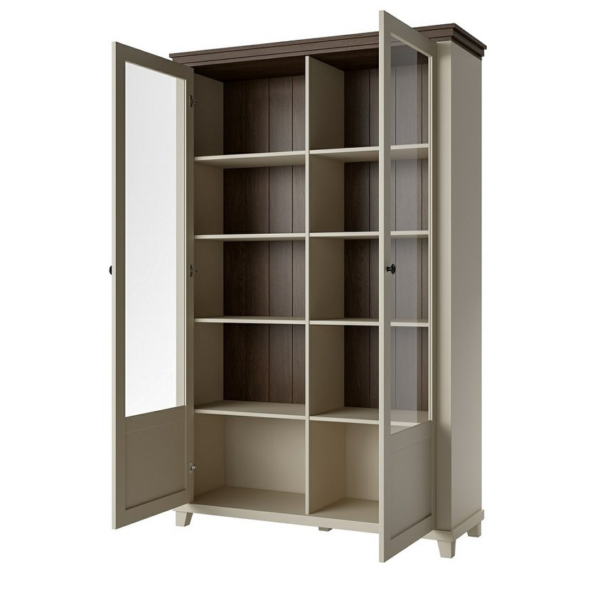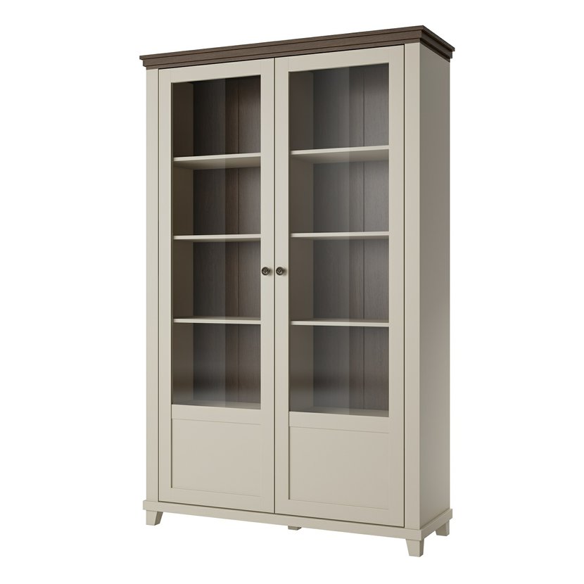 Elegantní dvoudvéřová vitrína Evora 3, nyní v jemném světlém béžovém odstínu s akcentem dekoru dub dunin, přináší do vašeho interiéru světlost a přirozený kontrast. Tato kombinace dodává nábytku příjemný, nadčasový ráz, který zjemní prostor a zároveň zachovává útulnost dřevěného vzhledu.