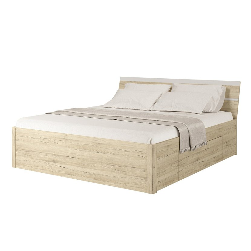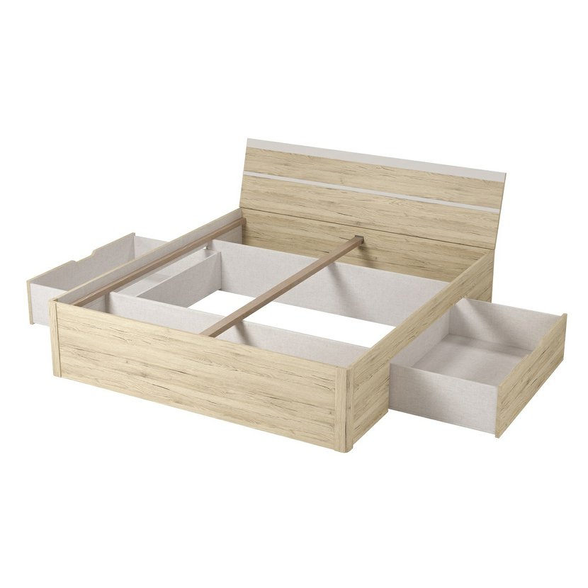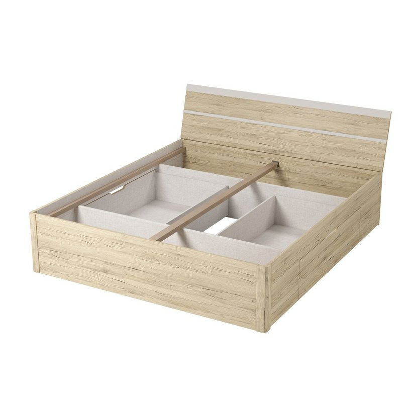 Další parametry a vlastnosti: materiál: LTD laminovaná dřevotřísková deska + ABS hrany ložná plocha: 180 x 200 cm matrace a roštje potřeba dokoupit, nejsou součástí - k posteli je potřeba rošt v rámu úložný prostor barevné provedení: dub san remo světlý / bílý mat