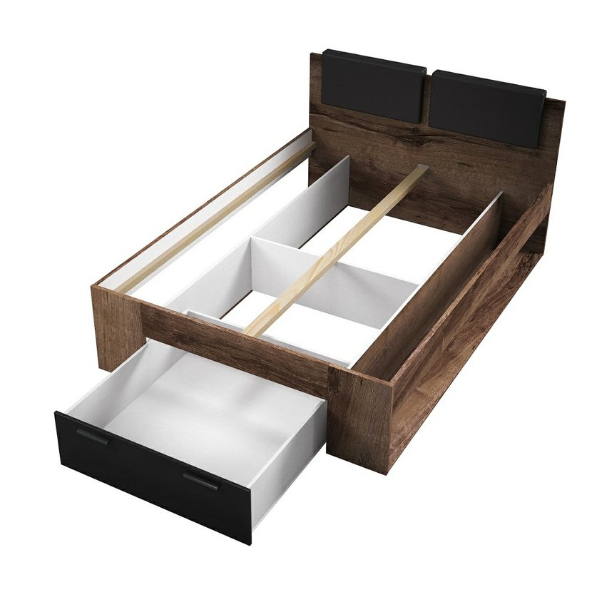Dopřejte si kvalitní spánek a moderní styl s dvoulůžkovou postelí Galaxy, která dokonale propojuje nejnovější designové trendy s vysokou funkčností. Postel s ložnou plochou 140 x 200 cm je ideální volbou pro menší ložnice nebo pro ty, kteří ocení kompaktní manželské lůžko. Postel se pyšní avantgardním vzhledem, který je založen na stylovém kontrastu tmavého dekoru dubu monastery a moderního černého lesku. Je vyrobena z odolné laminované dřevotřísky (LTD) a klade důraz na praktičnost díky svému integrovanému úložnému prostoru, který je perfektní pro uskladnění lůžkovin, sezónního oblečení nebo dalších předmětů, čímž pomáhá udržet v ložnici dokonalý pořádek.