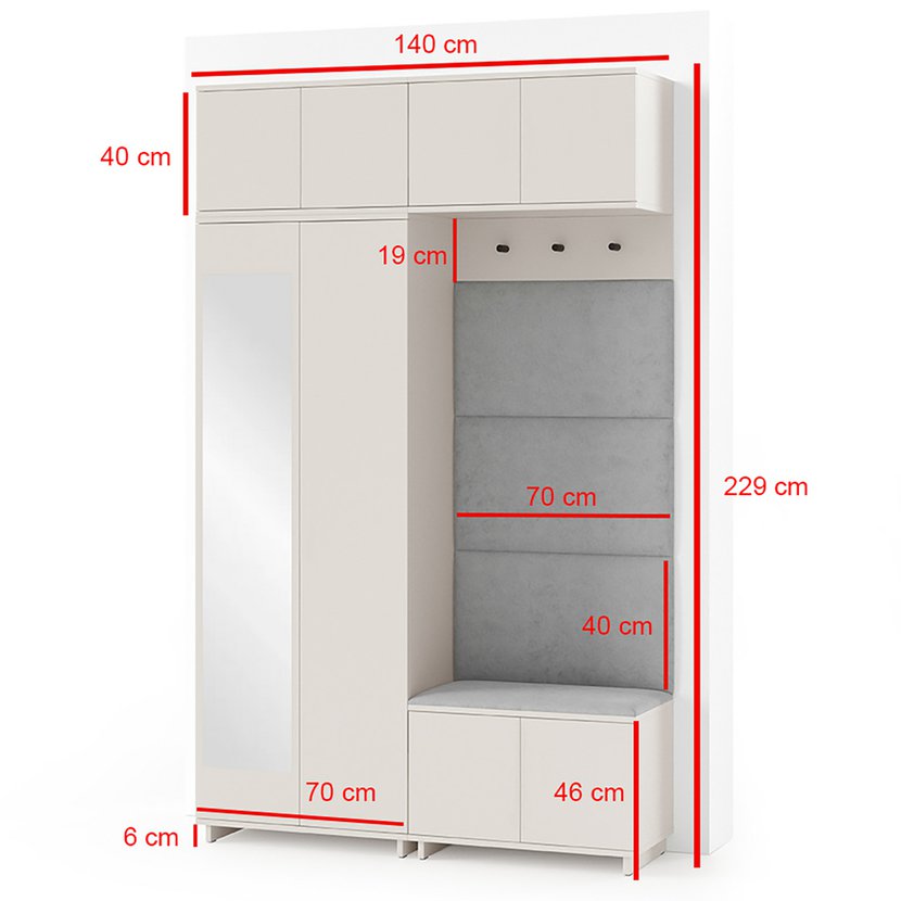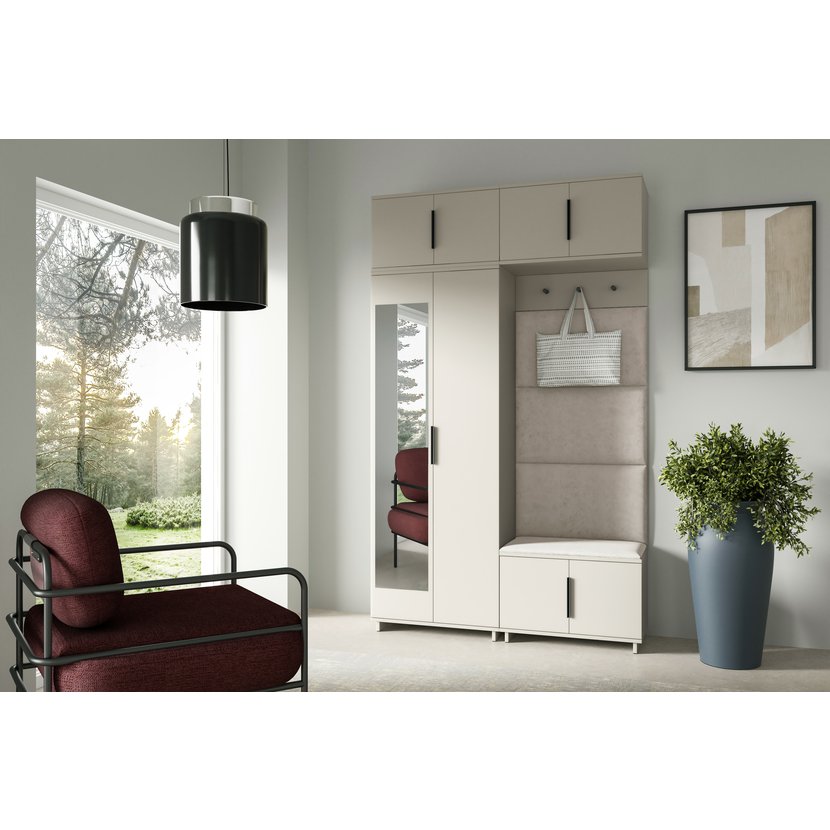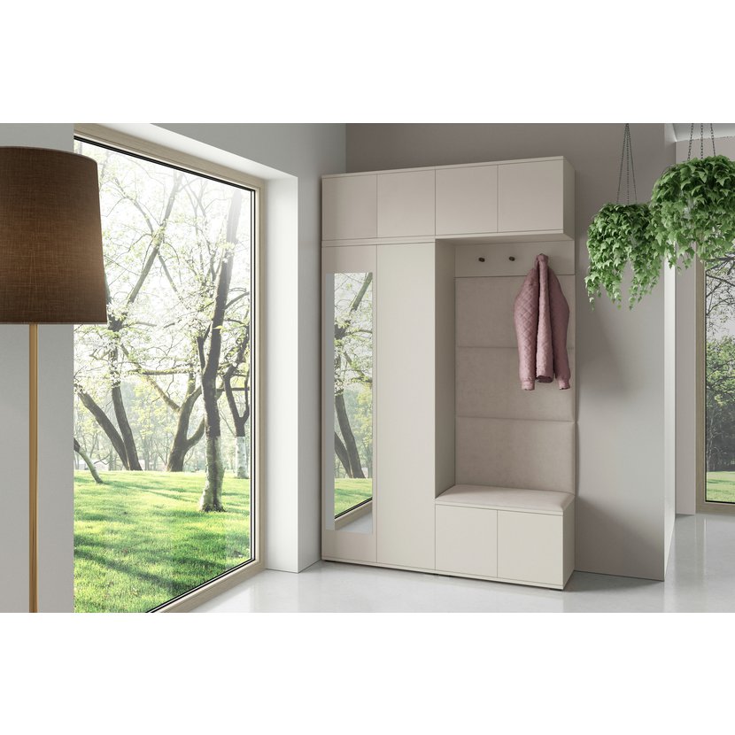 Předsíňová stěna Bianco – promyšlený design s možností výběru. Moderní předsíňová stěna v elegantním matném provedení nabízí nejen stylový vzhled, ale i praktické členění pro každodenní používání. Kombinace vysoké skříně se zrcadlem, čalouněného sedáku a horních úložných prostor vytváří funkční a harmonický celek.