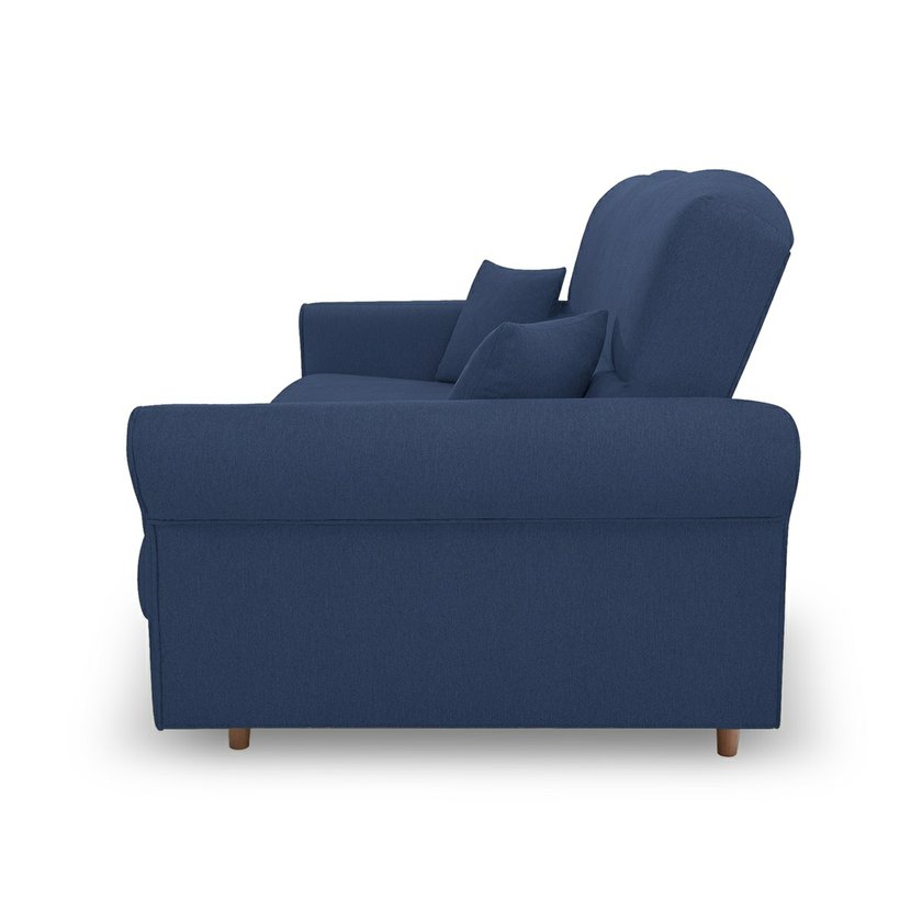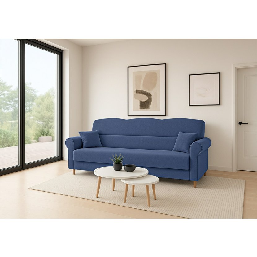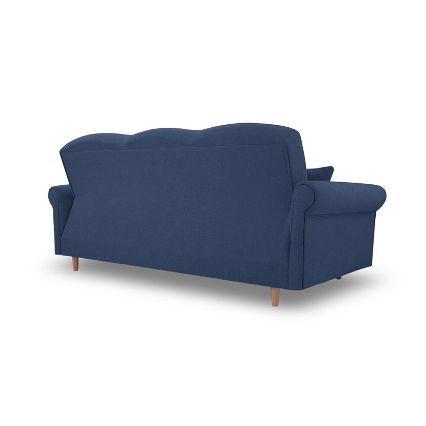 Třímístná pohovka Florine s rozkládací funkcí v tmavě modré barvě je elegantní a praktické řešení pro moderní i klasicky laděné interiéry. Nabízí pohodlné sezení pro tři osoby, snadnou rozkládací funkci pro příležitostné spaní a praktický úložný prostor na lůžkoviny či deky. Tmavě modré čalounění působí nadčasově, dodává interiéru sofistikovaný vzhled a zároveň se snadno kombinuje s ostatním nábytkem. Díky pevné konstrukci z masivu a dřevotřísky a komfortní výplni s pružinami Bonell poskytuje pohovka Florine vysoký komfort při každodenním používání a představuje ideální volbu pro ty, kteří hledají rozkládací pohovku s úložným prostorem v elegantním designu.