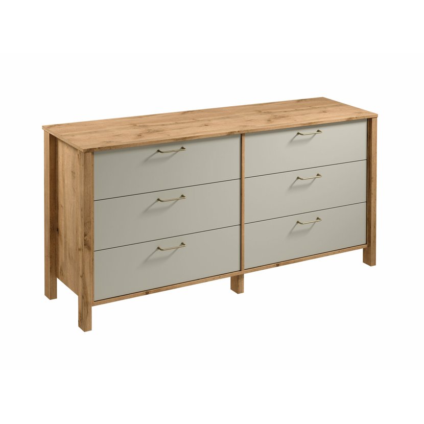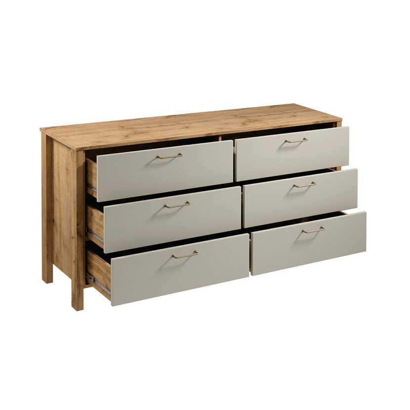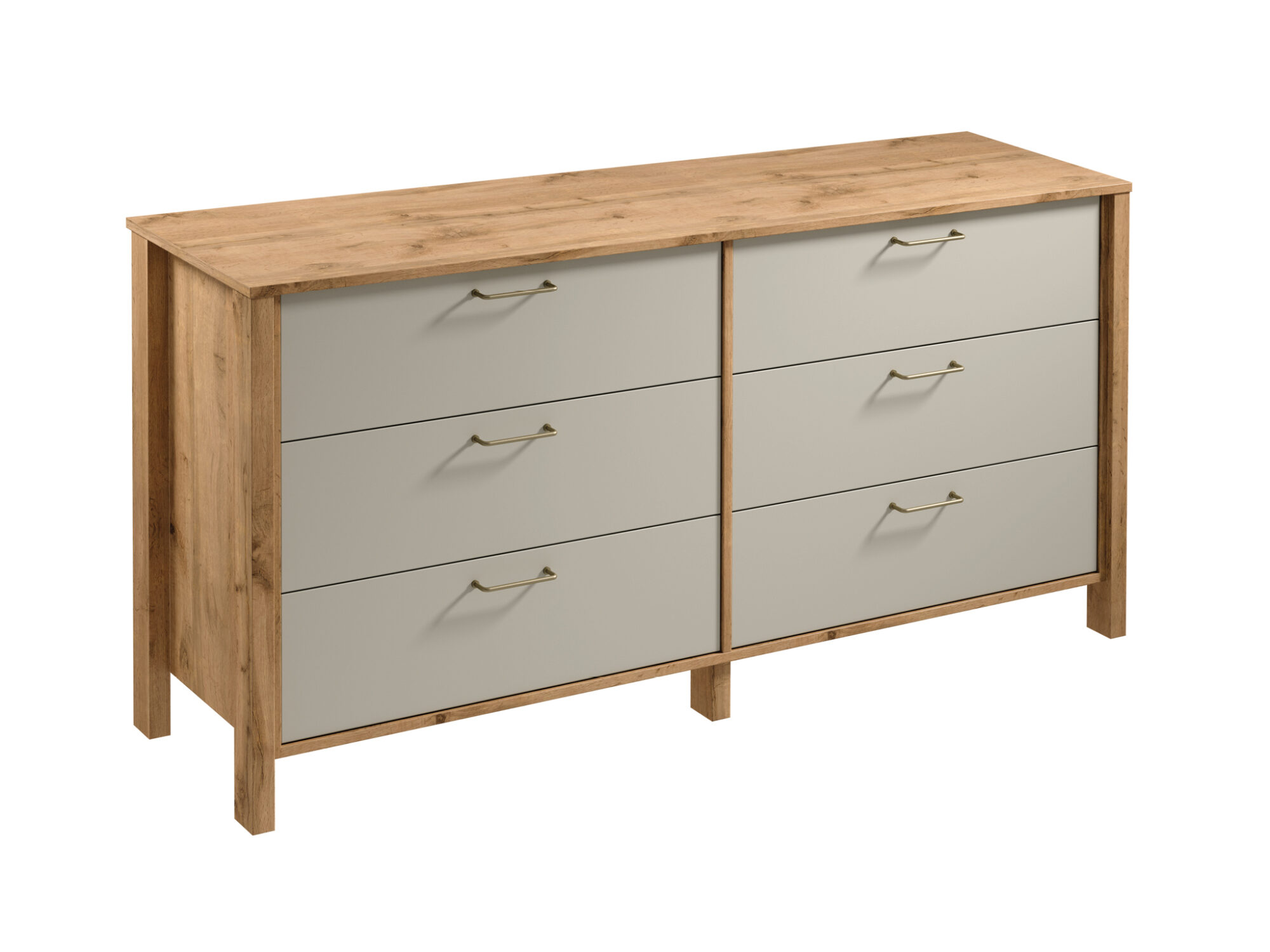 Komoda Indigo 4 je ideální volbou pro ty, kteří hledají elegantní a praktické řešení úložného prostoru. Nabízí šest prostorných zásuvek s plným výsuvem, které zajišťují snadný přístup a plynulý chod. Vyrobena je z odolné laminované desky, která odolává poškození a snadno se udržuje. Elegantní vzhled podtrhují matné zlaté kovové úchytky s ergonomickým tvarem, zatímco velká horní plocha poskytuje prostor pro dekorace či doplňky. Vysoké nohy umožňují snadný úklid pod nábytkem. Kombinace teplého odstínu dubu wotan s béžovou barvou dodává komodě přirozený a harmonický charakter. Komoda je součástí kolekce Indigo.