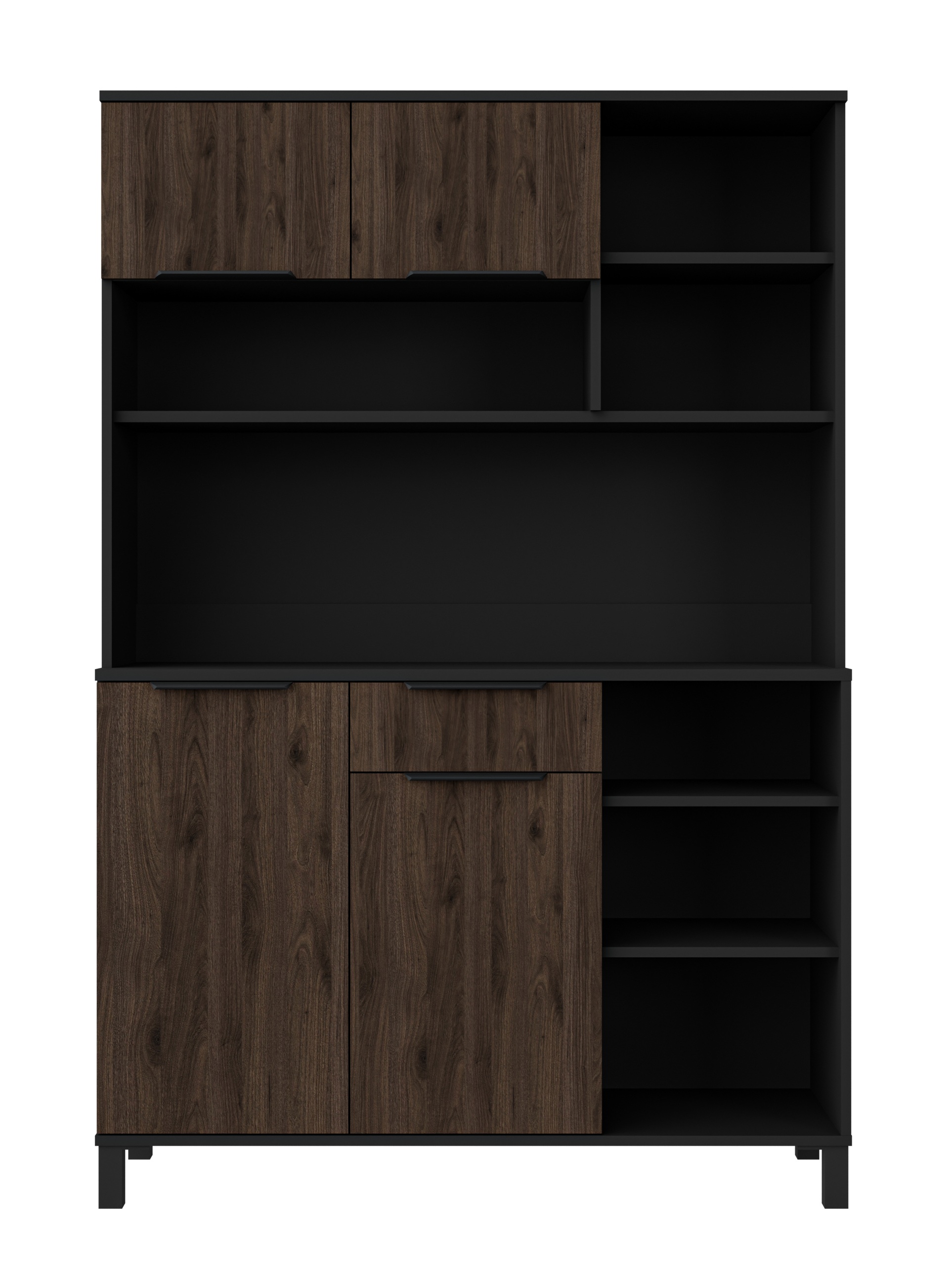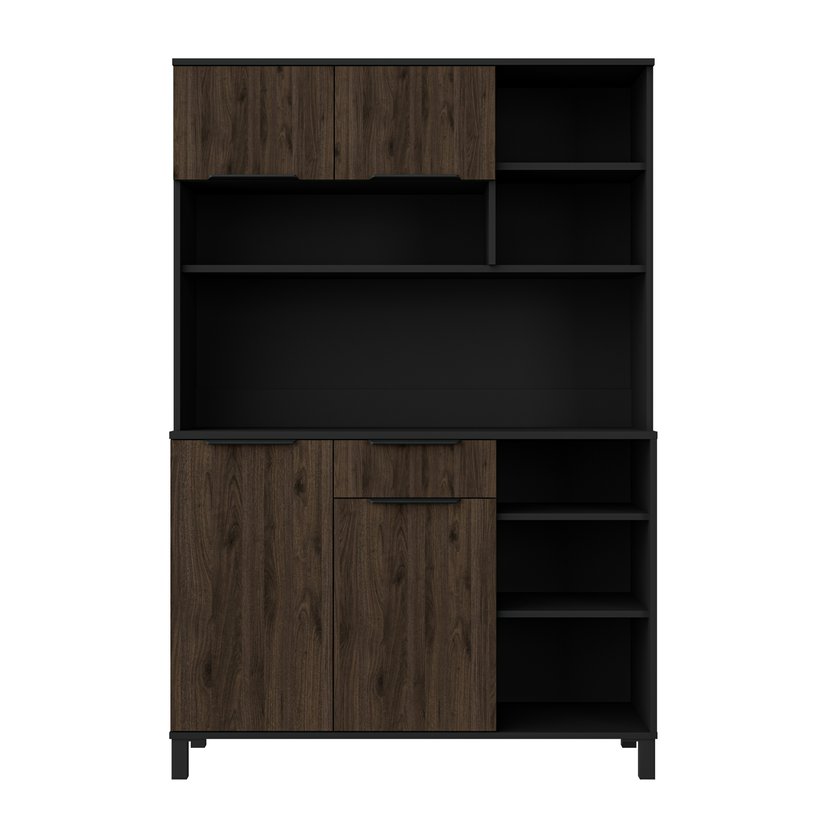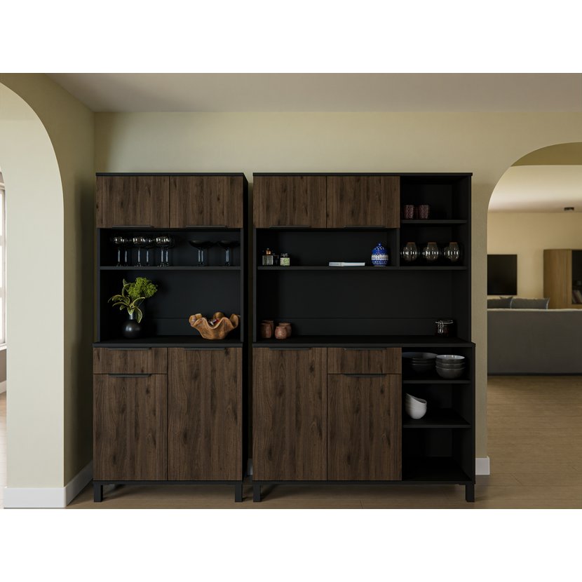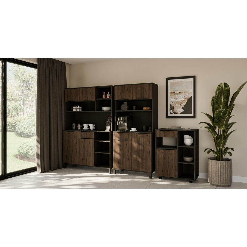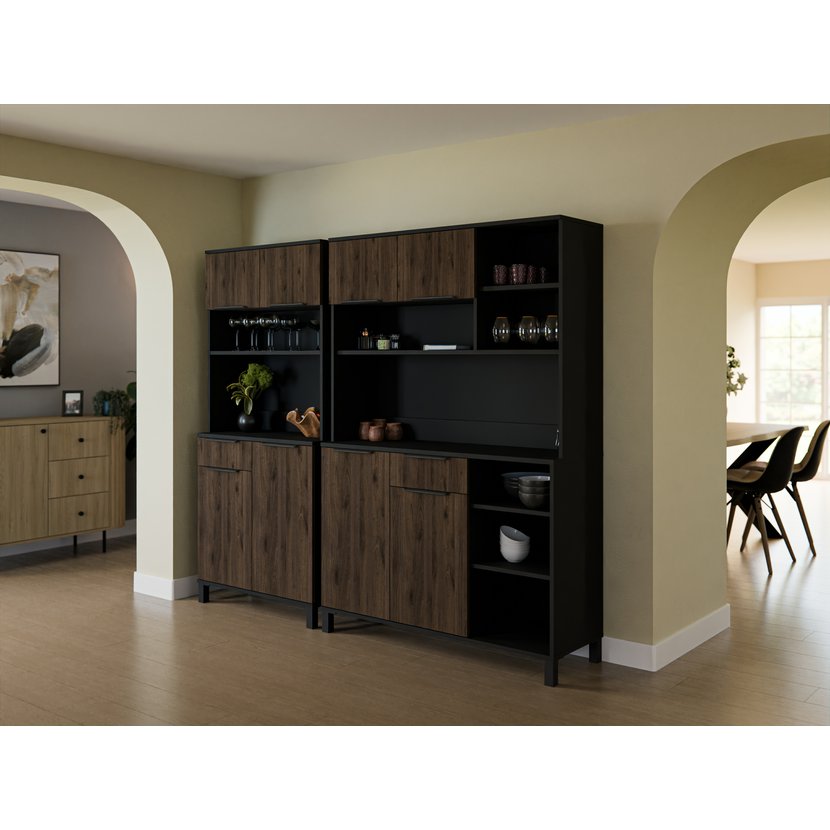Kredenc Monza 120 je elegantní a praktický doplněk každé kuchyně či jídelny. Kombinace černého korpusu s předními dvířky v odstínu ořech okapi dodává nábytku stylový a nadčasový vzhled, který skvěle ladí s moderními i skandinávskými interiéry. Kredenc je vyroben z vysoce kvalitní laminované dřevotřísky. Má prostorný vnitřní prostor. Spodní část nabízí skříňky a jednu šuplíkovou zásuvku. Horní část pak další úložný prostor, ideální pro kuchyňské nádobí, dekorace nebo drobnosti. Možno dokoupit Kredenc Monza 80 a Servírovací vozík Monza Roller.