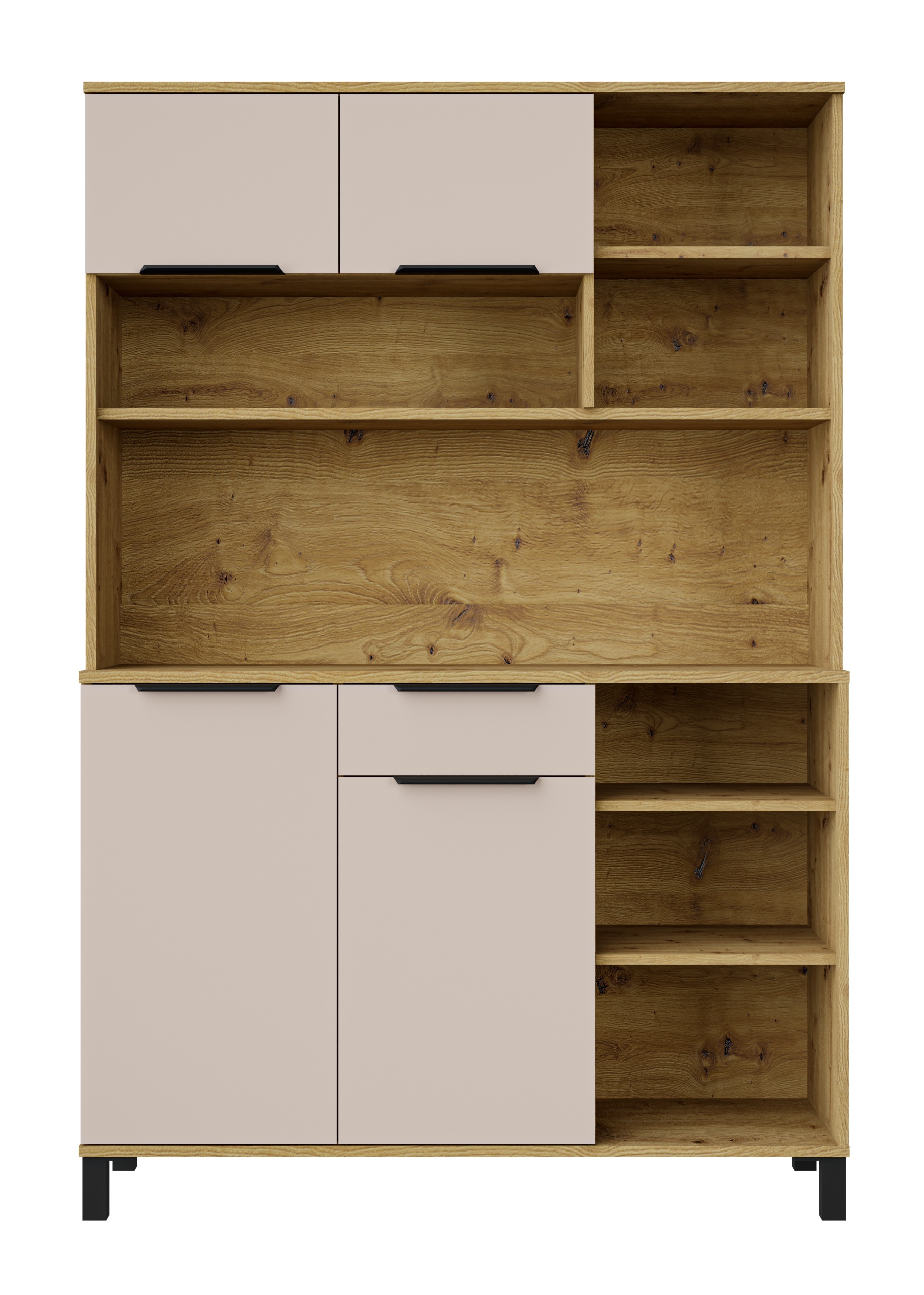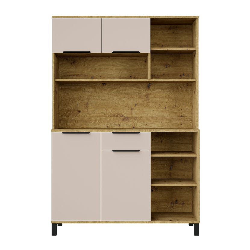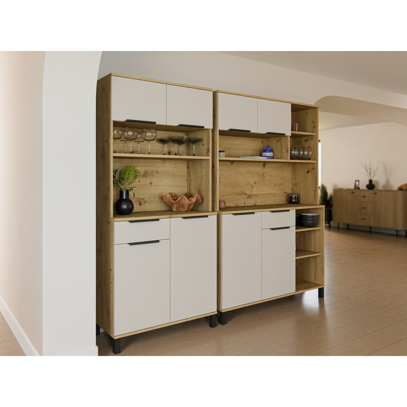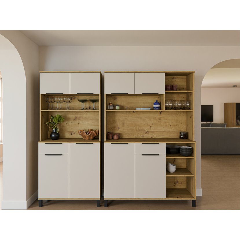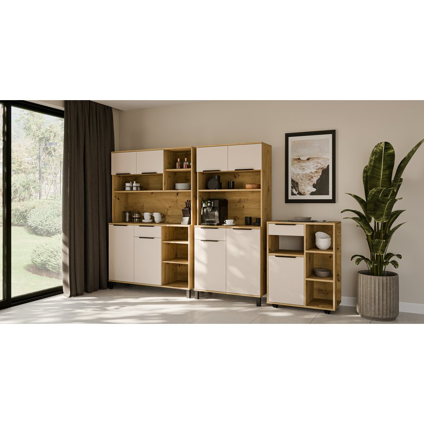 Kredenc Solea 120 je elegantní a praktická skříňka, která osvěží vaši kuchyni, jídelnu či obývací pokoj. Korpus v dekoru dub artisan spojený s dvířky v jemném odstínu kašmír vytváří v interiéru příjemnou a nadčasovou atmosféru. Díky kvalitní laminované desce s ABS hranami a pevným kovovým úchytům je nábytek odolný a snadno udržovatelný. Prostor uvnitř poskytuje dostatek úložných možností. Ideální pro nádobí, potraviny či drobnosti. Jednoduchý a čistý design se snadno kombinuje s různými styly interiérů a díky kompaktním rozměrům je vhodný i do menších prostor. Možno dokoupit Kredenc Solea 80 a Servírovací vozík Solea Roller.