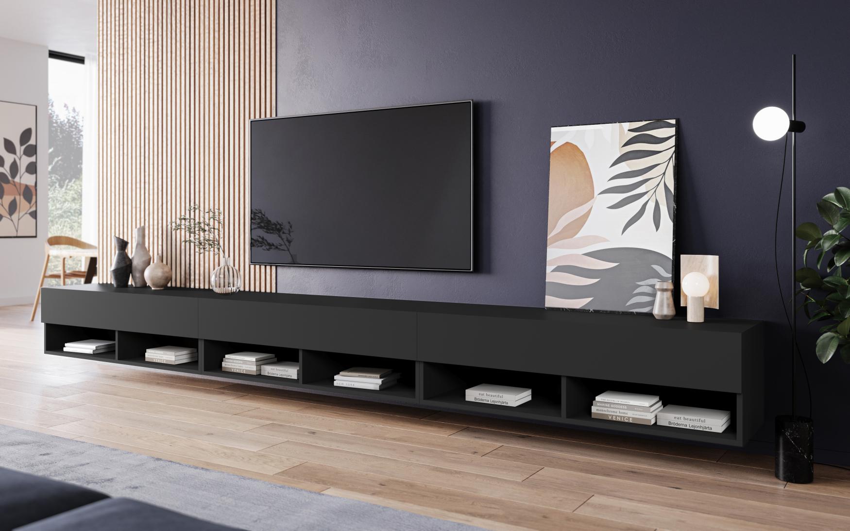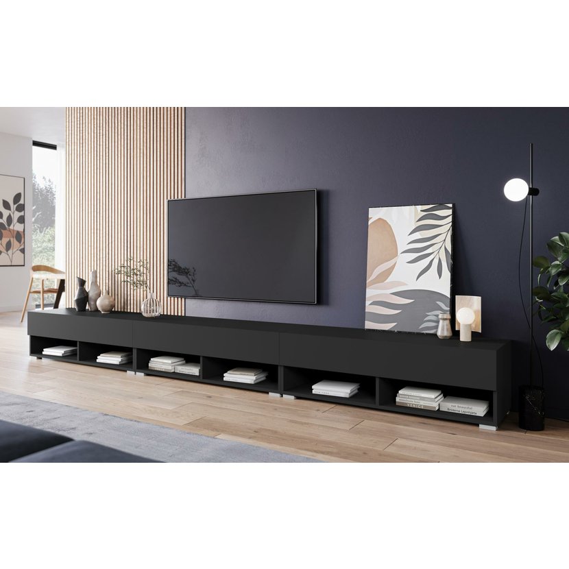 TV stolek Lowboard A 300 v elegantním matném černém odstínu je moderní a praktické řešení pro obývací pokoj. Tento prostorný lowboard vnese do interiéru nadčasový vzhled a zároveň nabízí dostatek úložného prostoru. Sestává ze tří samostatných skříněk, které po sestavení tvoří celek o délce 300 cm, což poskytuje prostor pro televizní techniku, dekorace nebo další vybavení obývacího pokoje. Horní část s výklopnými dvířky nabízí skryté úložné prostory, zatímco spodní otevřené police jsou vhodné pro elektroniku nebo stylové doplňky. Stolek lze jednoduše zavěsit na stěnu pro vzdušný moderní efekt, nebo postavit na nožky – nožky i montážní materiál jsou součástí balení. Korpus je vyroben z laminované dřevotřískové desky s ABS hranami, což zajišťuje odolnost a snadnou údržbu. Bezúchytkový systém otevírání podtrhuje jeho minimalistický a elegantní design.