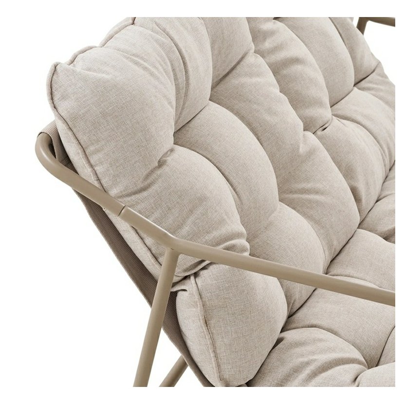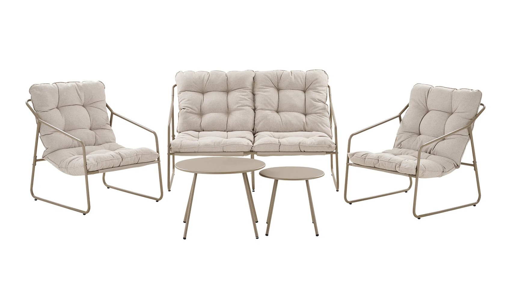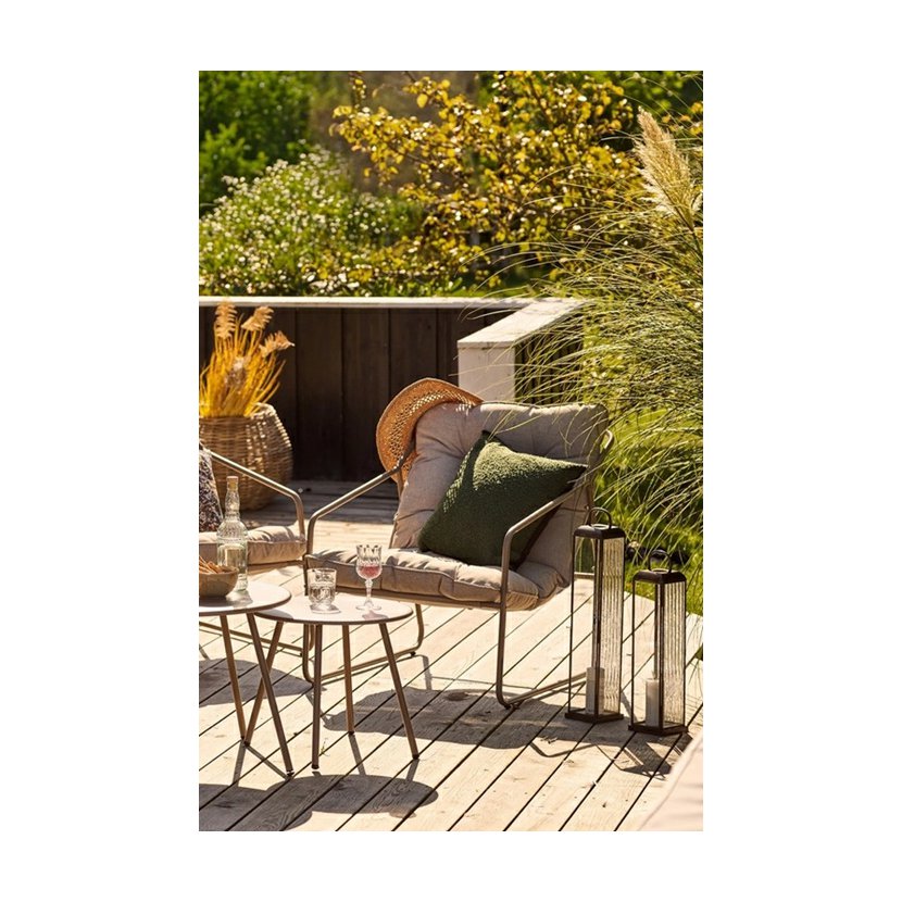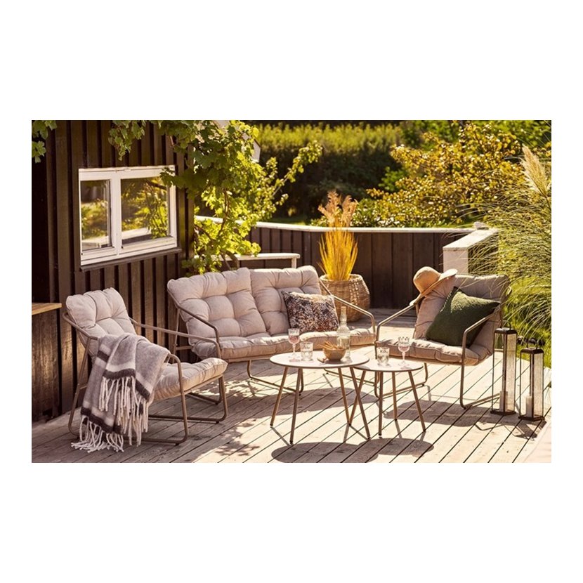 Stylový zahradní lounge set Nilo je ideální volbou pro vytvoření pohodlného posezení na terase, balkoně nebo zahradě. Moderní design v elegantní pískové barvě se snadno kombinuje s různými styly venkovního prostoru a dodá mu příjemnou atmosféru. Set je vyroben z pevné ocelové konstrukce, která zajišťuje stabilitu a dlouhou životnost. Součástí jsou také pohodlné polstrované sedáky, díky nimž si užijete maximální komfort při relaxaci i setkání s rodinou či přáteli. Kompaktní rozměry umožňují využití i na menších terasách nebo balkonech. Lounge set obsahuje dvoumístnou pohovku, dvě křesla a konferenční stolek, takže nabízí dostatek prostoru pro příjemné venkovní posezení až pro čtyři osoby.