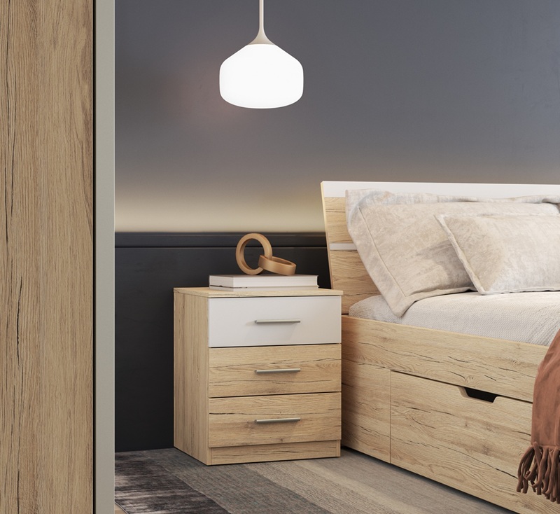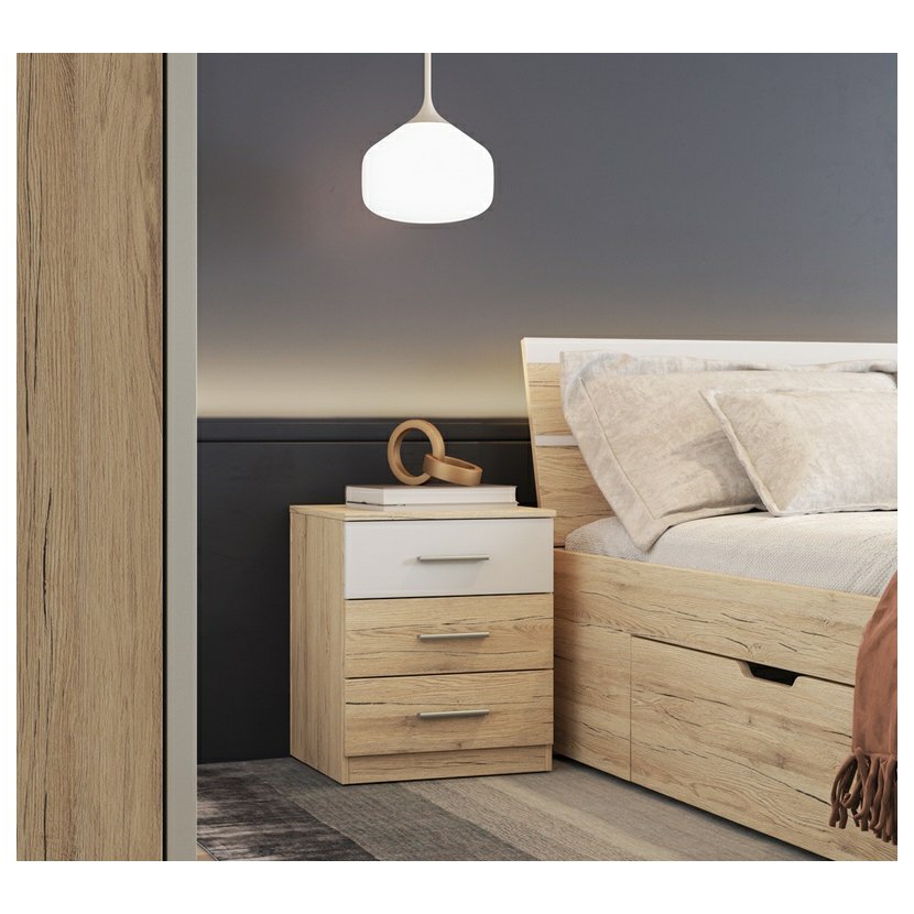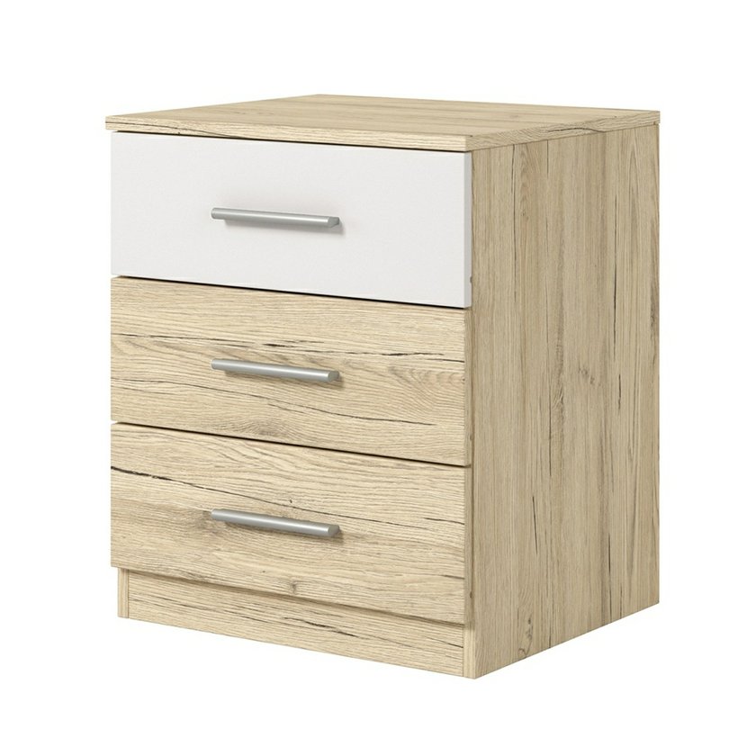 Noční stolek Beta v kombinaci dub san remo světlý a bílá je praktický a stylový doplněk do každé ložnice. Vyniká moderním, čistým designem a kvalitním provedením z laminované desky s odolnými ABS hranami - ideální pro každodenní používání. Stolek nabízí tři prostorné zásuvky, které poskytnou dostatek úložného prostoru na osobní věci, knížky, lampičku nebo telefon. Díky univerzálnímu barevnému provedení snadno sladíte stolek s ostatním nábytkem kolekce Beta nebo s jiným nábytkem ve světlých interiérech.