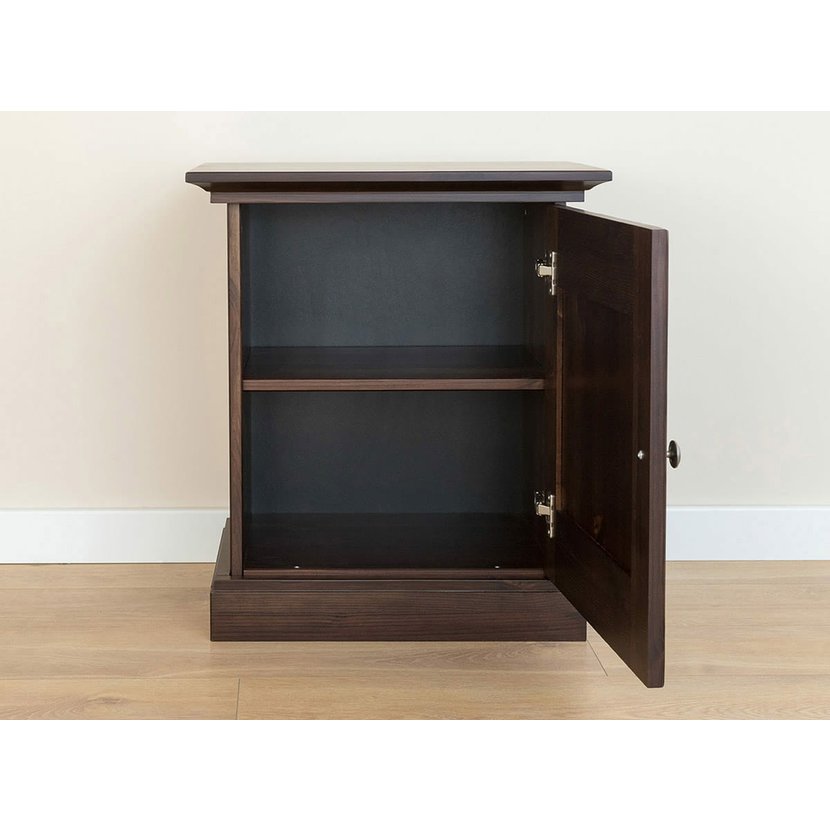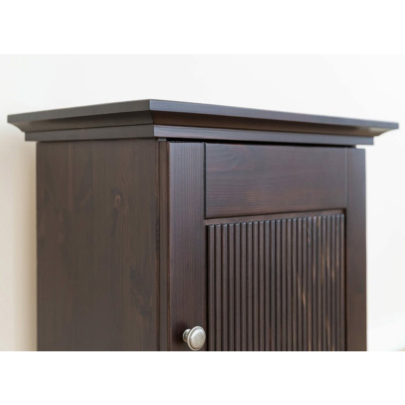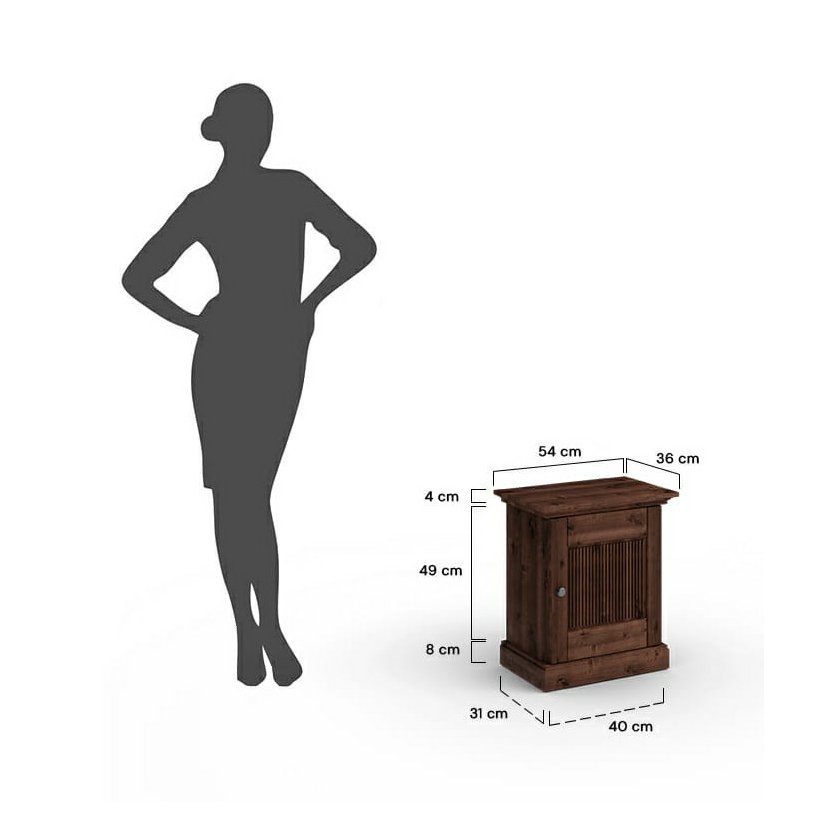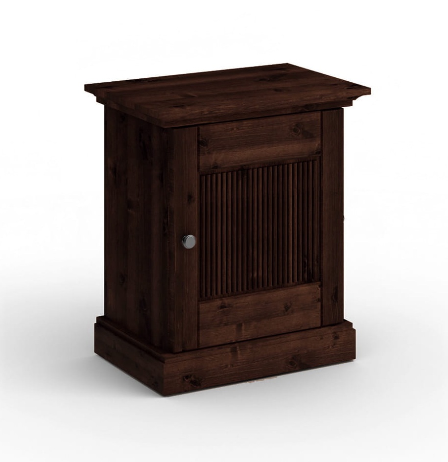 Noční stolek Rosella z masivní borovice - tabacco s 70% krytím barvy na vodní bázi, díky kterému zůstává patrná přirozená kresba dřeva. Uvnitř je praktická police, ideální pro uspořádání věcí jako jsou knihy, nabíječky nebo jiné drobnosti, které chcete mít po ruce, ale ne přímo na ploše stolku.