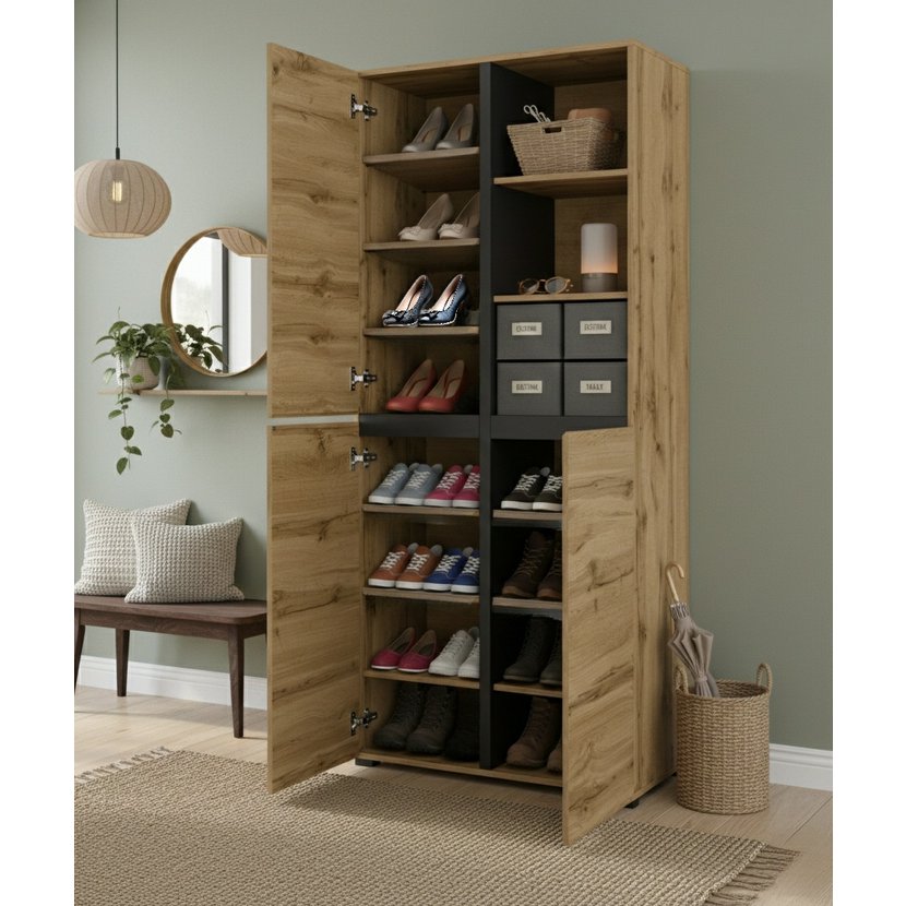 police v otevřené části jsou rovné, police za dvířky jsou zešikmené pro uložení obuvi