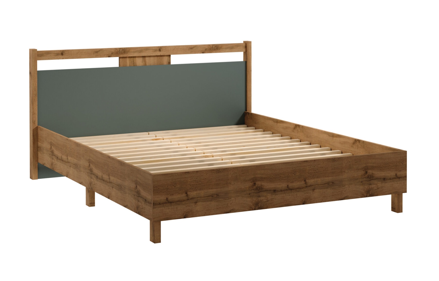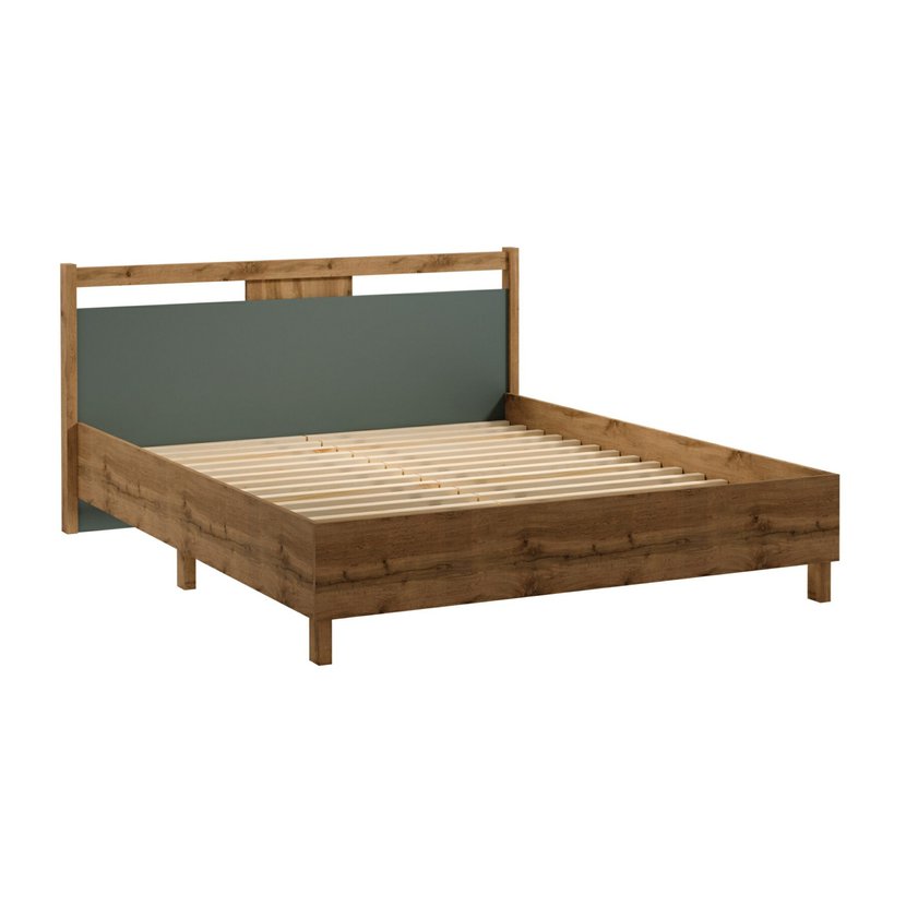 Postel Indigo 160 x 200 cm nabízí moderní design a kvalitní zpracování. Je vyrobena z laminované desky odolné proti poškození a doplněna lamelovým roštem z borovicového dřeva, který zajišťuje pevnost a pohodlí. Ložná plocha poskytuje dostatek prostoru pro pohodlný spánek. Kombinace teplého odstínu dubu wotan v zelené barvě vytváří přirozený a harmonický vzhled, který se hodí do moderních i klasických interiérů. Postel je součástí kolekce Indigo.