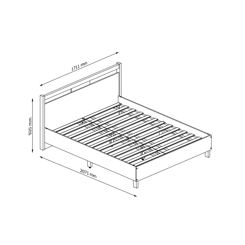 síla materiálu: čelo postele 18 mm / bočnice 16 mm / nohy 36 mm / laťky 15 mm