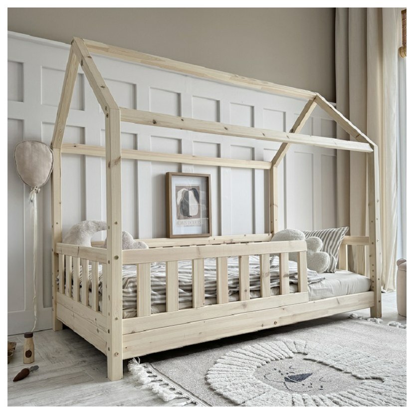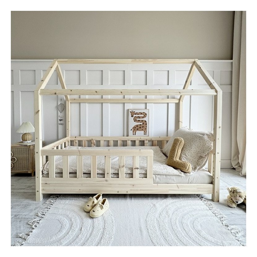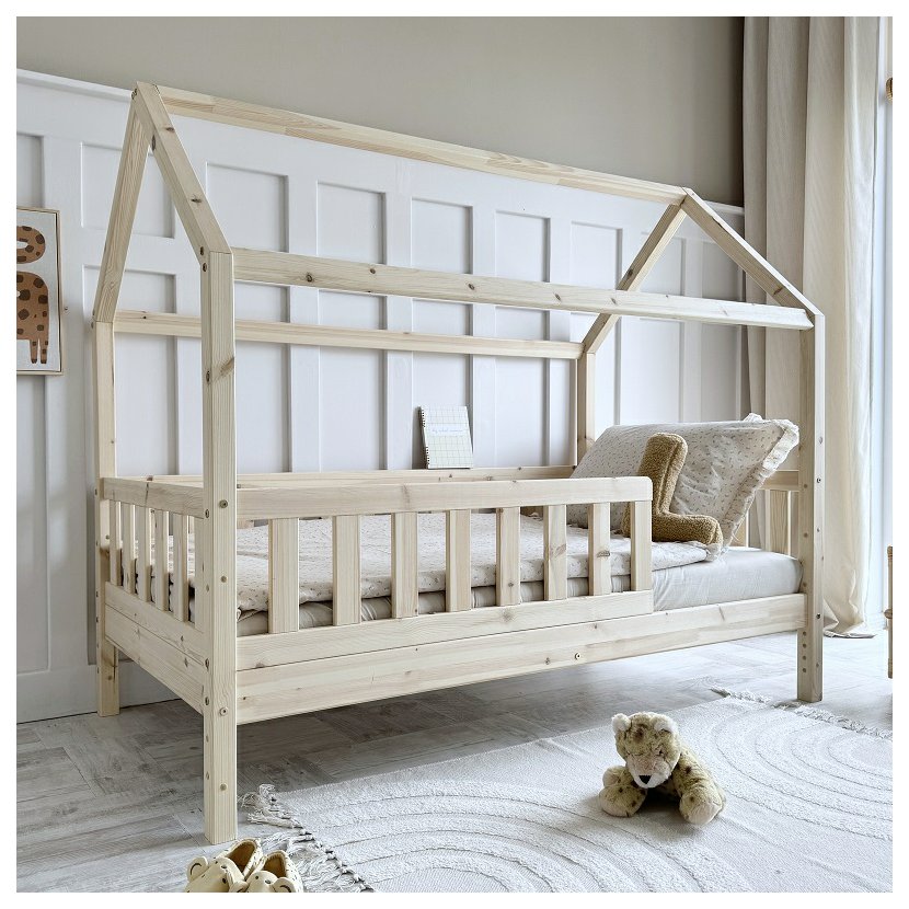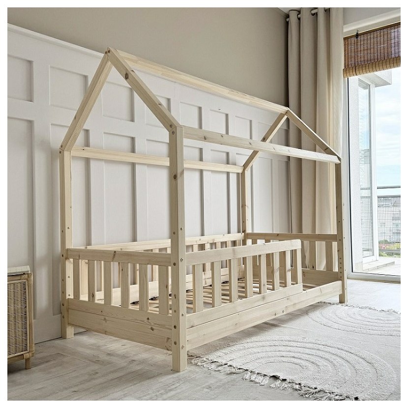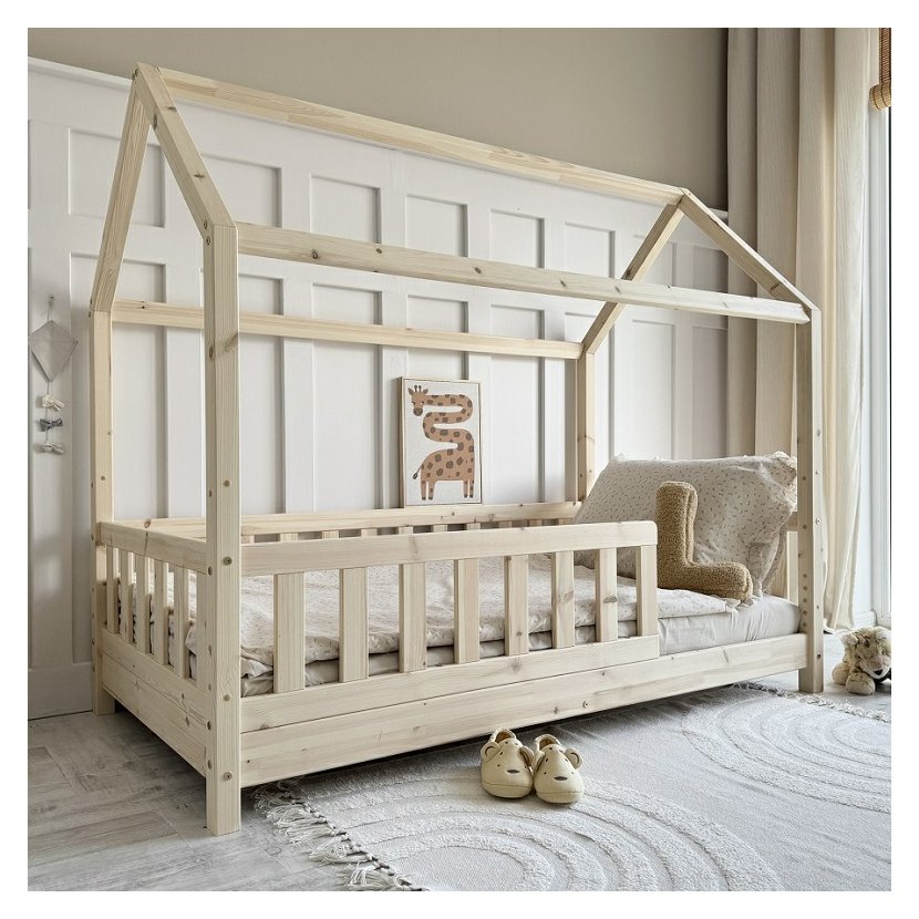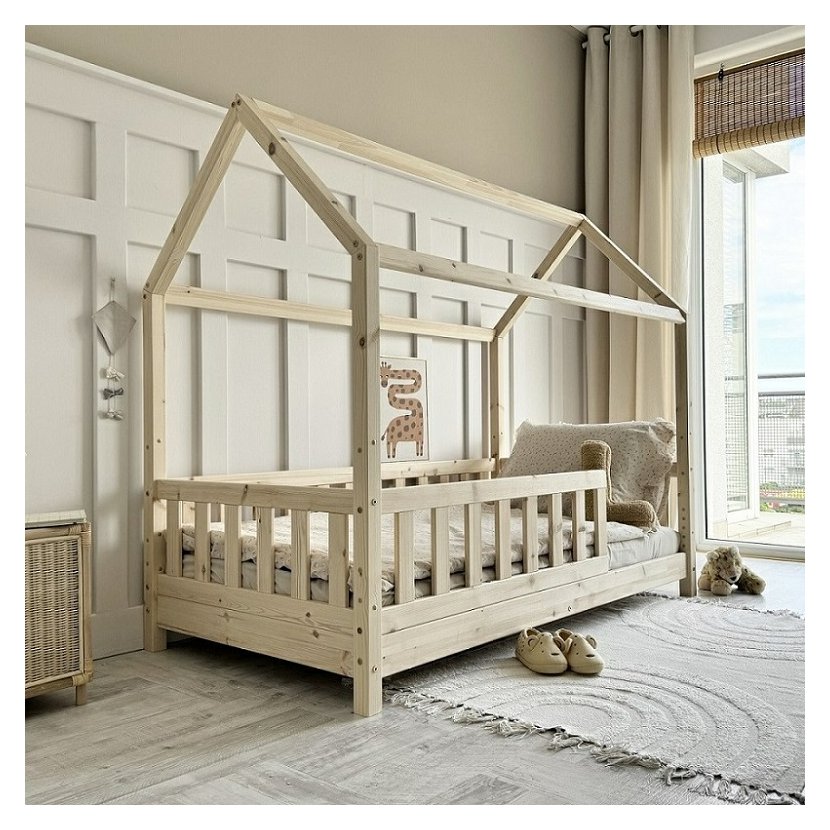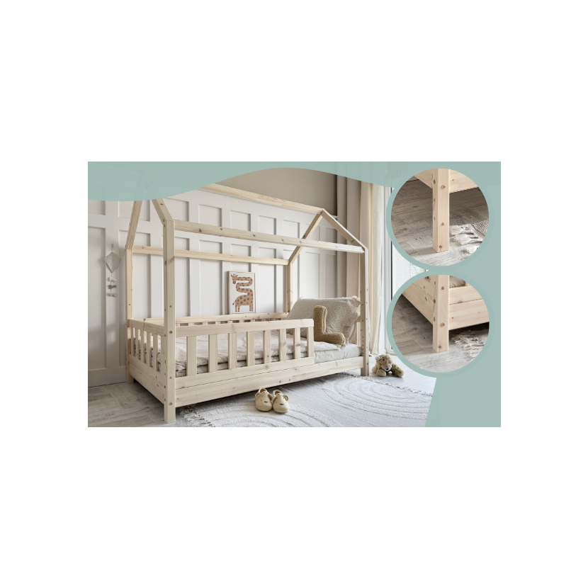 Postel je vyrobena z pevného přírodního dřeva, které vyniká svou odolností a zároveň přírodní texturou, jež snadno zapadne do skandinávského či moderního interiéru. Díky rozměru 90×190 cm poskytuje dostatek prostoru pro kvalitní spánek, přičemž zachovává kompaktnost vhodnou i do menších pokojů. Díky jednoduchému, ale promyšlenému designu „domečku“ postel vytváří bezpečné místo pro relaxaci a spánek, kde se vaše dítě bude cítit „jako doma“.