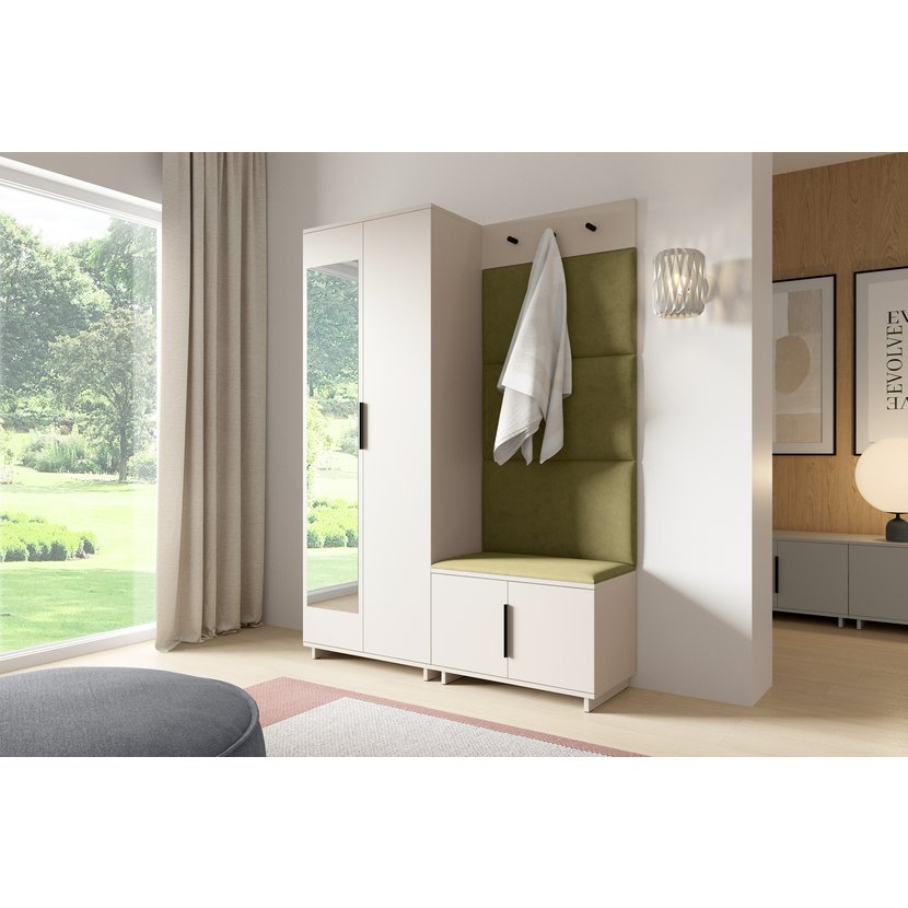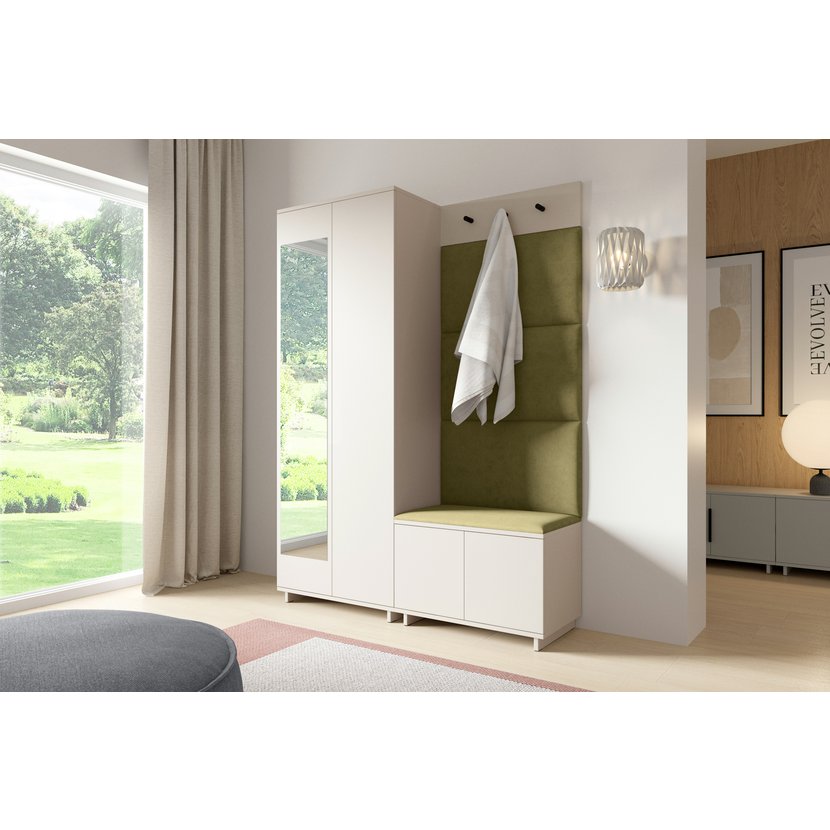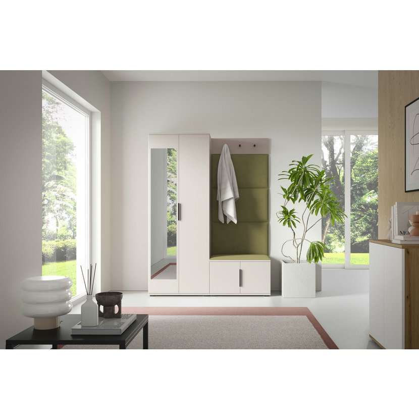 Předsíňová stěna Bianco – promyšlený design s možností výběru. Moderní předsíňová stěna v elegantním matném provedení nabízí nejen stylový vzhled, ale i praktické členění pro každodenní používání. Kombinace vysoké skříně se zrcadlem, čalouněného sedáku a horních úložných prostor vytváří funkční a harmonický celek.