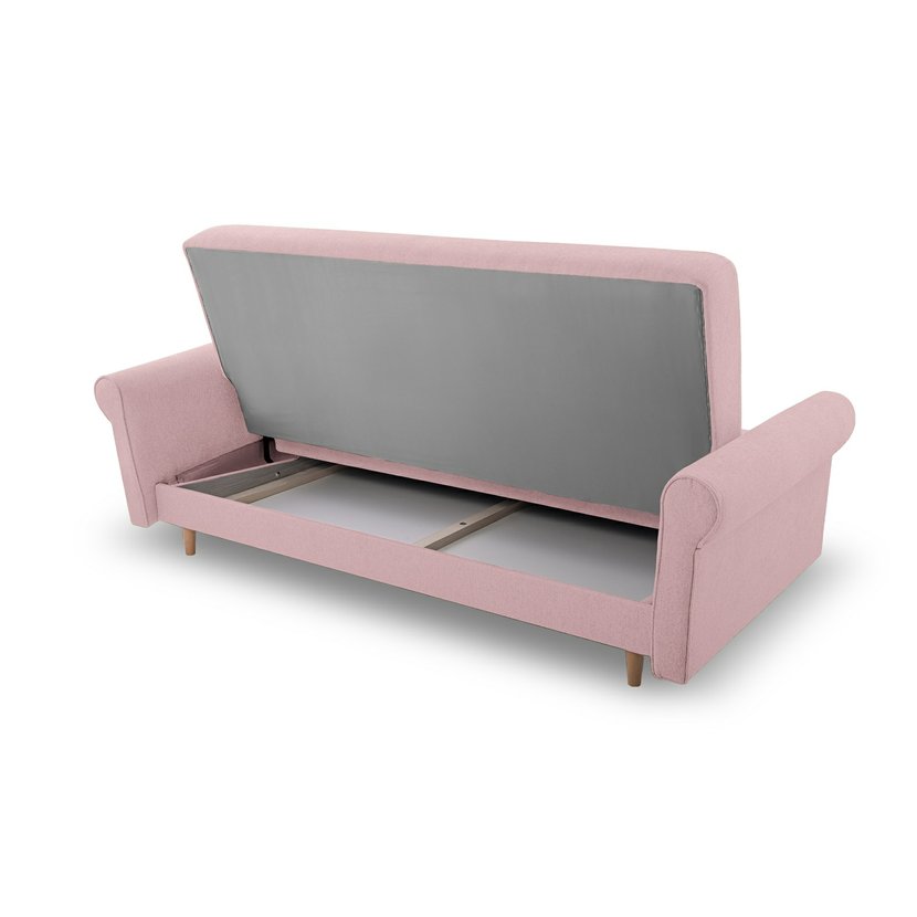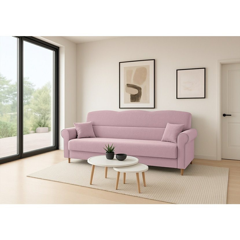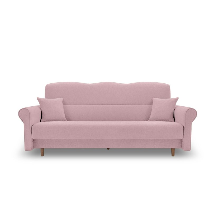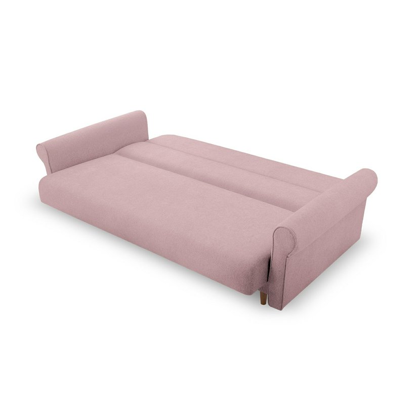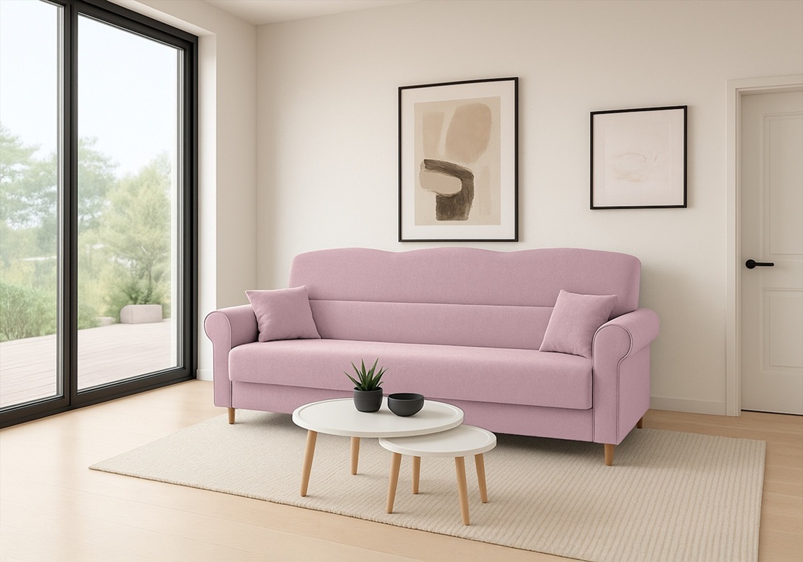 Třímístná pohovka Florine s rozkládací funkcí ve starorůžové tkanině přináší do interiéru jemnost, eleganci a vysokou míru praktičnosti. Nabízí pohodlné sezení pro tři osoby, snadno ovladatelnou rozkládací funkci pro příležitostné spaní a praktický úložný prostor pro lůžkoviny či textilie. Starorůžové čalounění působí hřejivě a nadčasově, krásně doplní moderní i romanticky laděné interiéry a dodá jim osobitý charakter. Díky pevné konstrukci z masivu a dřevotřísky a komfortní výplni s pružinami Bonell poskytuje pohovka Florine pohodlí při každodenním používání a je ideální volbou pro ty, kteří hledají stylovou rozkládací pohovku s úložným prostorem a důrazem na design.