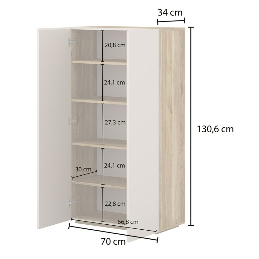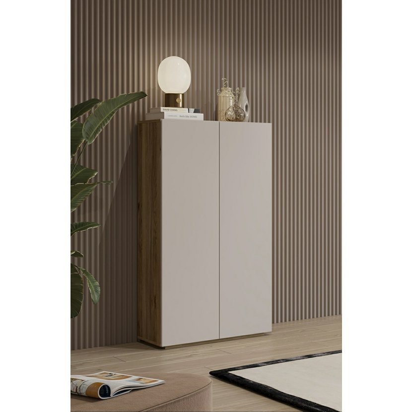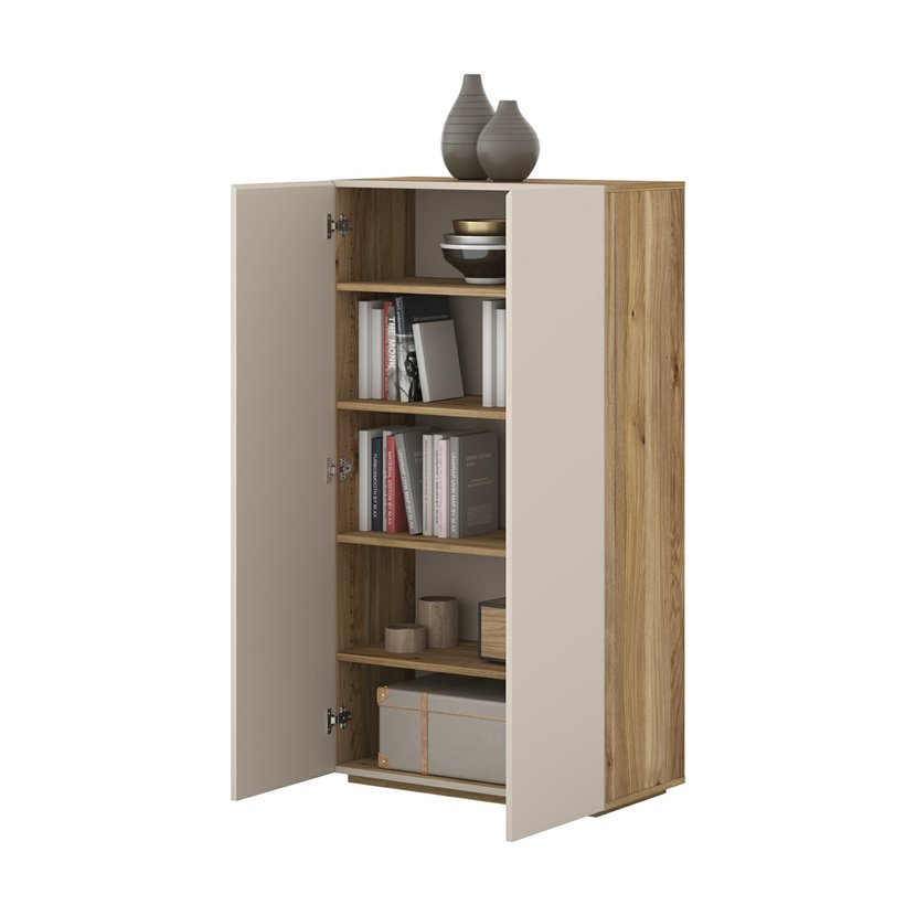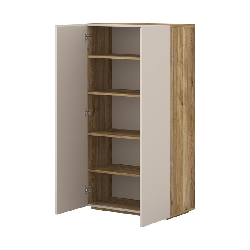 Vysoká komoda Criss v elegantní kombinaci korpusu v dekoru dub mauvella a dvířek v moderním odstínu kašmír je ideálním úložným řešením pro každý interiér. Díky svému nadčasovému vzhledu snadno zapadne do obývacího pokoje, ložnice, pracovny i předsíně. Komoda je vybavena dvěma plnými dvířky, která ukrývají prakticky členěný vnitřní prostor s několika policemi. Poskytuje tak dostatek místa pro oblečení, dokumenty, doplňky nebo domácí potřeby.